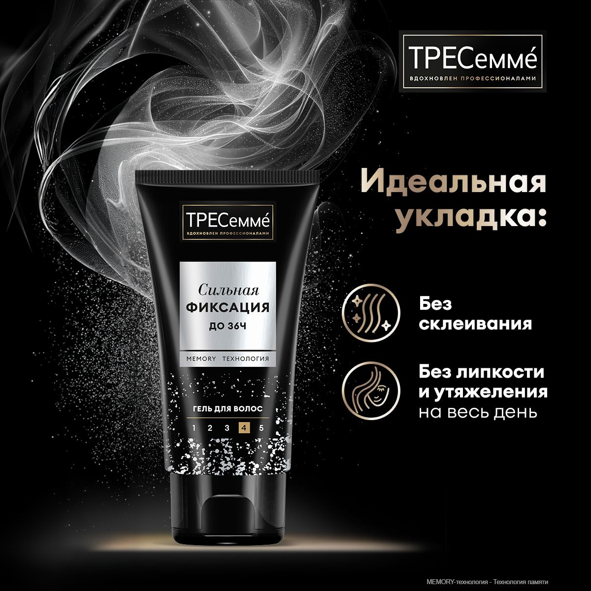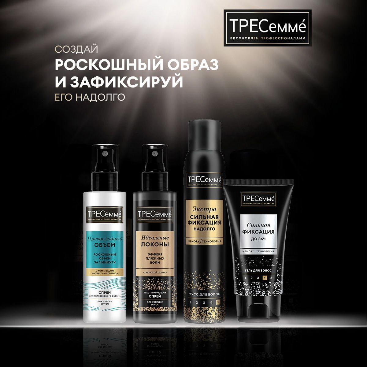Эксперты ТРЕСеммé создали коллекцию стайлингов с уникальной* MEMORY-технологией, которая позволяет подготовить волосы к созданию твоего идеального образа без склеивания, липкости и утяжеления на весь день. *в ассортименте ТРЕСеммé MEMORY - технология памяти